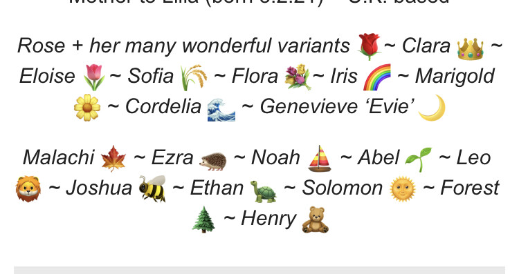 [name_f]Eloise[/name_f]: Another timeless classic. It feels less delicate and more strong that [name_f]Rose[/name_f] and [name_f]Clara[/name_f] (which is not a bad thing). I picture a strong willed intelligent woman.